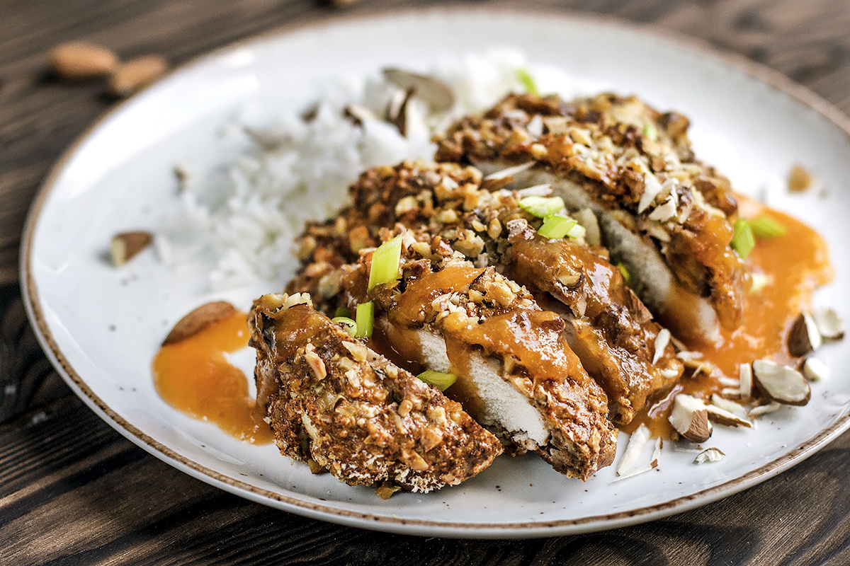 Шаг 2: В отдельной миске взбейте яйца. Куриное филе нарежьте на порционные кусочки, приправьте солью и перцем. Обваляйте каждое филе сначала в яйцах, затем в ореховой панировке, повторив процесс дважды — это придаст блюду хрустящую корочку.