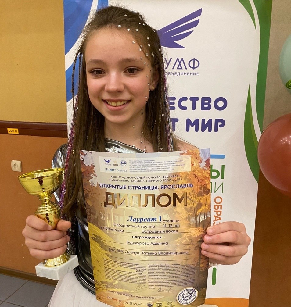 Солистка вокальной эстрадной студии «А+Б» Аделина Башкурова получила звание лауреата I степени.На XIX Международном конкурсе-фестивале музыкально-художественного творчества «Открытые страницы». Он состоялся в Ярославле.