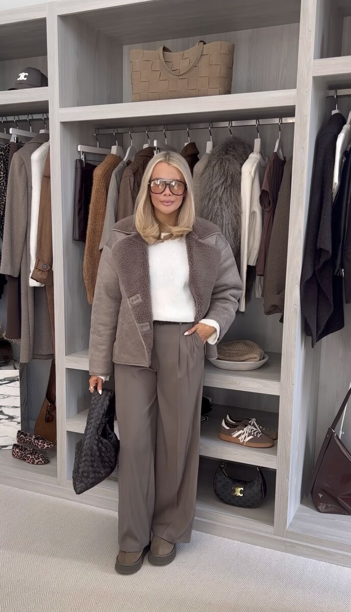 - Классика на каждый день: Темно-коричневые брюки в сочетании с укороченной дубленкой и уютными ботинками на толстой подошве создадут стильный, но в то же время минималистичный образ. Базовый белый лонгслив добавит свежести и подчеркивает лаконичность.