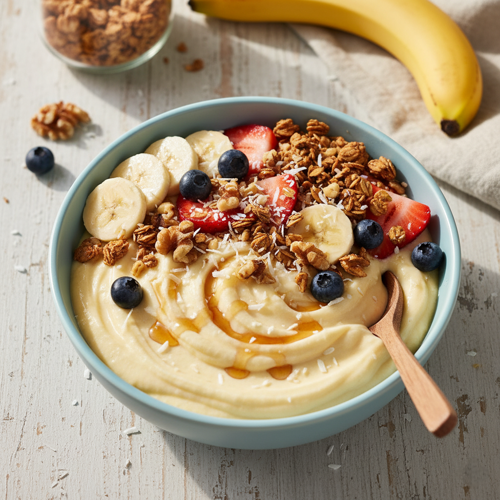 Как только достигнута желаемая консистенция, перенесите готовую массу в глубокую миску. Смело украшайте десерт выбираемыми топпингами: гранолой, свежими ягодами и орехами. Главное — подавать десерт сразу, пока он не начал таять!