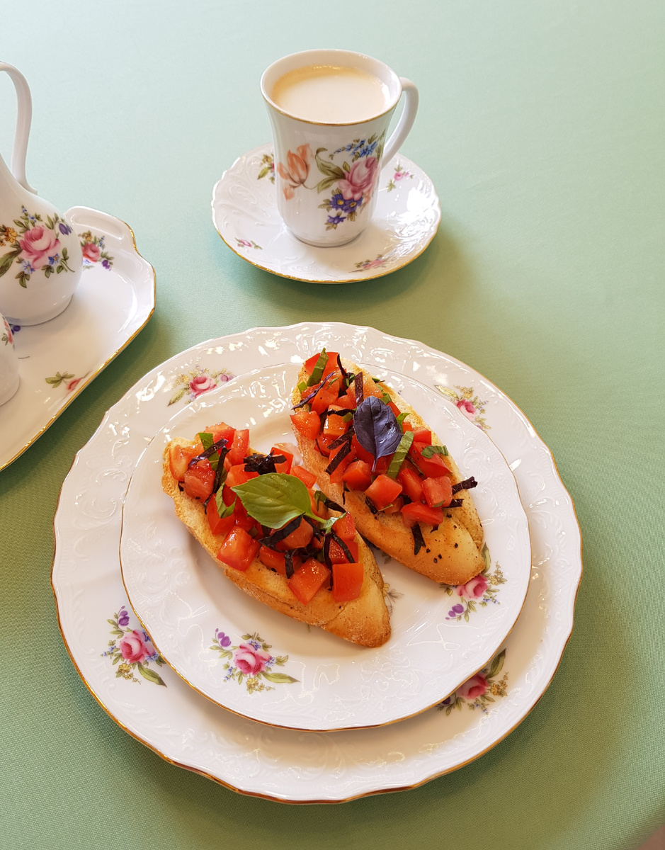 Намазанный чесночной масляной прослойкой хлеб становится основой, на которую выкладывают помидорную смесь. От этого блюда не ждут сложной техники — важнее баланс свежих трав, кисло?сладких помидоров и лёгкой кислинки уксуса, чтобы акценты не растворились в масле.