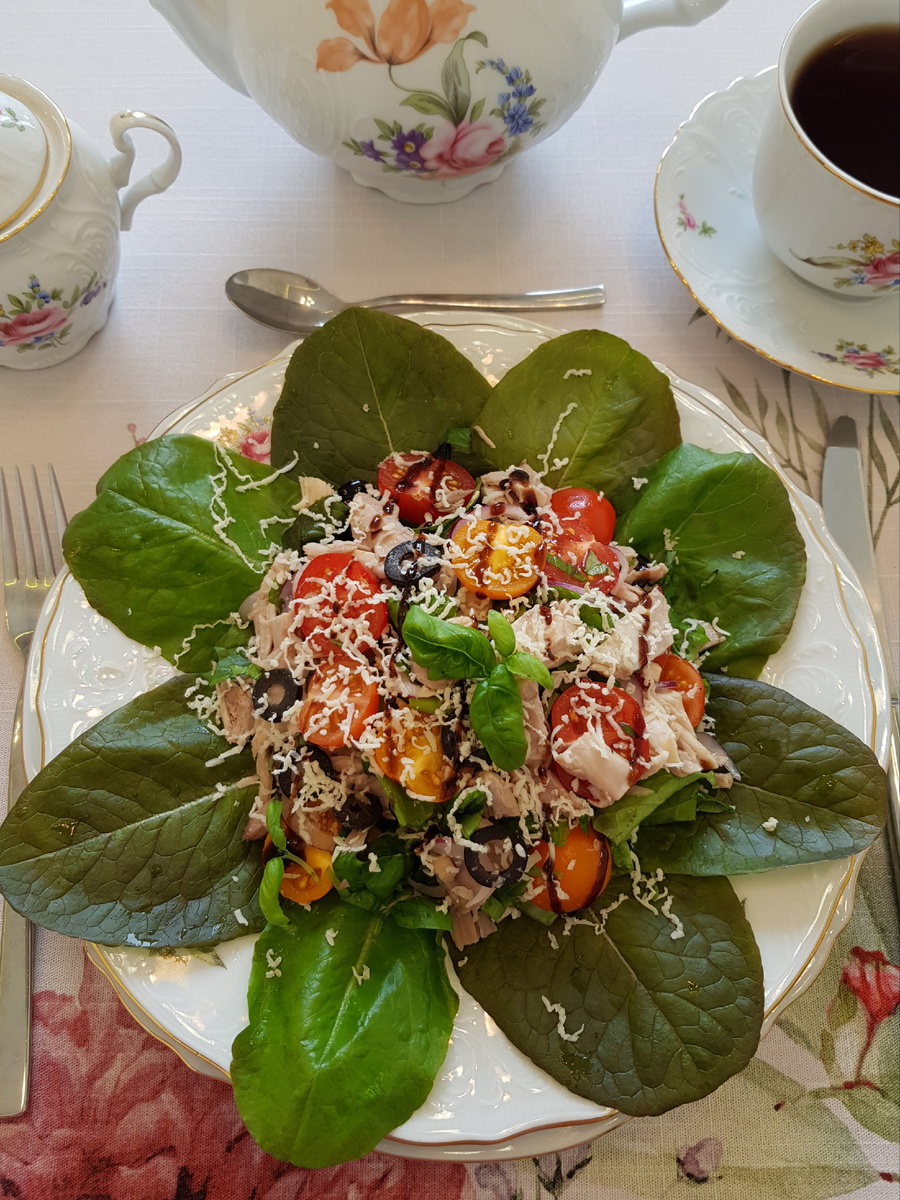 Соберите ингредиенты на тарелке так, чтобы по краю разместились целые листья салата и украсили верхушками базилика. Осторожно перемешайте салат с заправкой, добавьте помидоры и посыпьте сыром. Финальный штрих — капля бальзамического соуса и небольшие побеги базилика сверху. Получается легкое, гармоничное блюдо, которое можно собрать за считанные минуты и подать к любому столу.