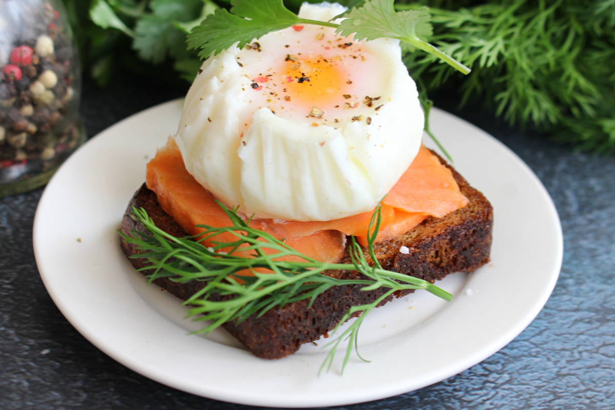 Осторожно освободите яйцо пашот от пленки — если пленка не была смазана маслом, яйцо легко выходит с помощью столовой ложки. Разместите яйцо на гренке, добавьте щепотку перца и по желанию посолите, украсив свежей зеленью. Если рыба уже обладает ярко выраженным соленым вкусом, дополнительная соль может быть излишней.
