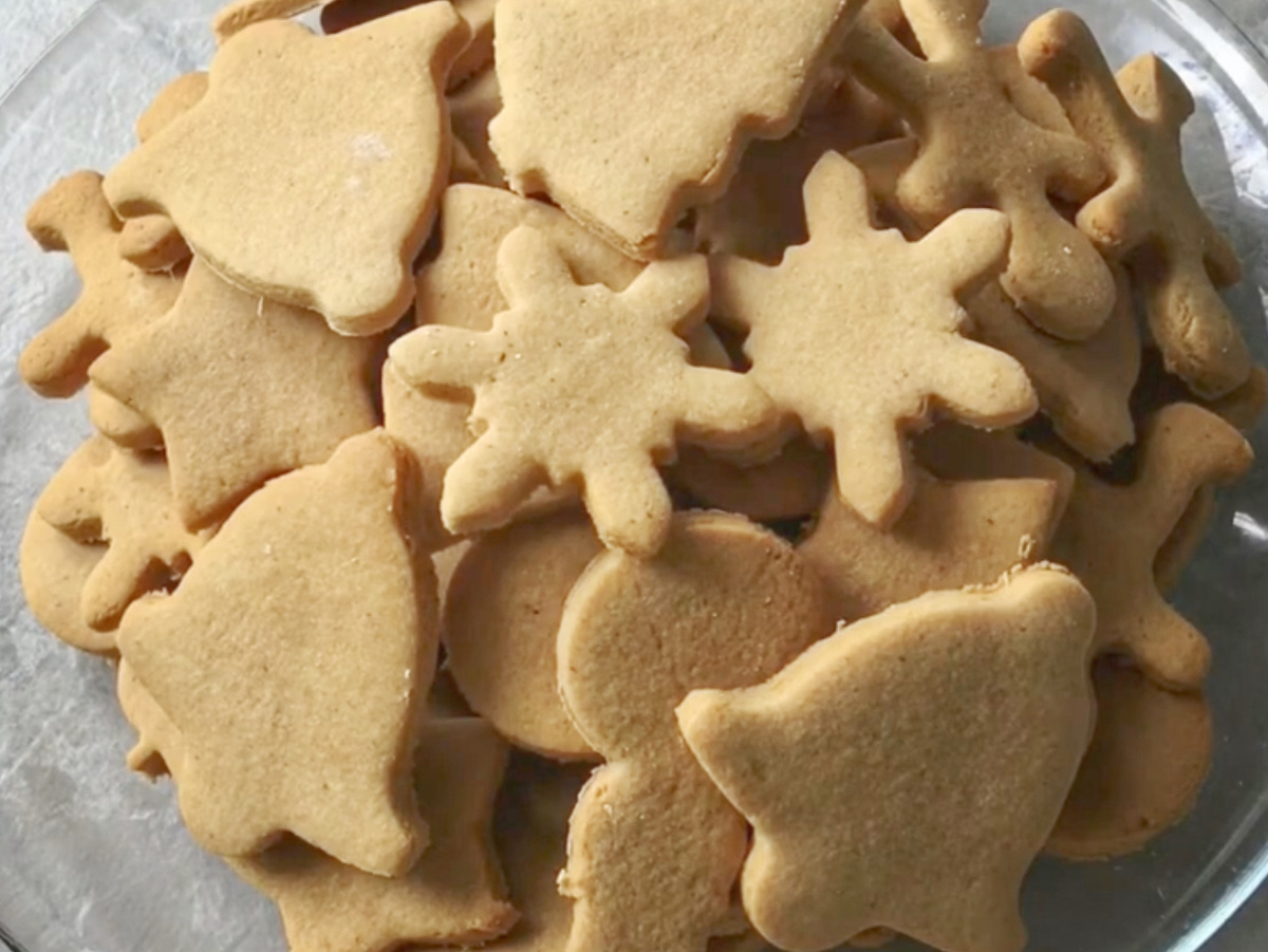 Охлаждённое тесто раскатать на слегка присыпанном мукой столе до толщины 3-4 мм. Вырежьте фигурки: это может быть всё что угодно — от сердечек до звёздочек, и отлично подойдут руки юных помощников. Тесто не будет крошиться, что делает его удобным в работе.