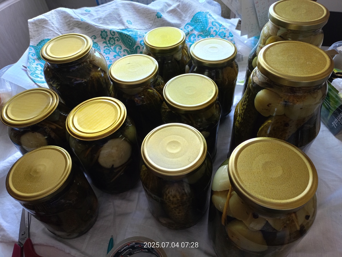 Переходя к банкам, их нужно хорошо промыть и продезинфицировать, а специи слегка бланшировать. Сперва бланшируют те, что пойдут на дно банки, а потом укладывают их туда. Затем обдают кипятком огурцы и укладывают их в банки. Добавляют по одному-два бланшированных томата, сверху помещают оставшиеся специи, заливают горячим рассолом и закатывают. Всё это финиширует оставлением банки в перевернутом виде до полного остывания. Хранить банки можно в темном прохладном месте, например, в подвале. Зимой, открывая такую банку, можно насладиться настоящим гордостью домашнего консервирования.