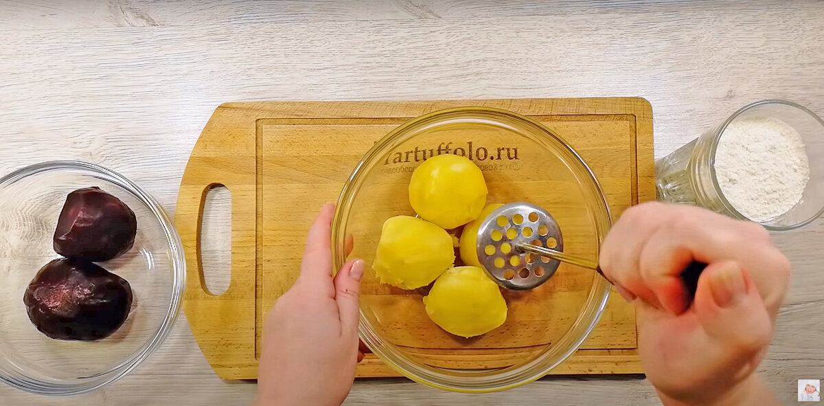 После того, как свекла будет подготовлена, ее нужно объединить с картофельным пюре. Приправьте смесь солью и черным перцем по вкусу, затем добавьте одно яйцо и тщательно перемешайте. Постепенно вводите муку, замешивая тесто. Обратите внимание, что оно должно быть довольно липким, что придаст готовому блюду особую текстуру.