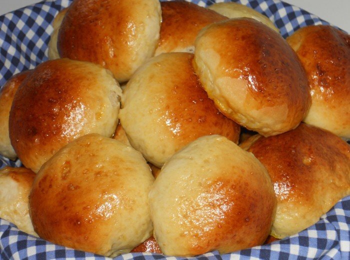 Когда тесто будет готово, формируем из него маленькие булочки и укладываем их на противень. Даем расстояться в течение 20 минут, после чего смазываем молочно-желтковой смесью и выпекаем в духовке при температуре 200 °С около 20 минут.
