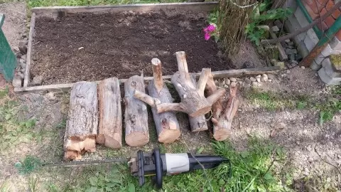 Из яблони осталась высота около 2,5 метров, ранее она служила опорой для банок. Корни дерева сгнили, и старый ствол был срезан с легкостью цепной пилой. Материал оказался не только подходящим для мангала, но и для создания новой атмосферы на даче. За один короткий период удалось распилить не только яблоню, но и старые ветви, образовав внушительную кучу дров.