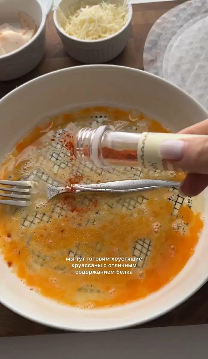 Приготовление этих удивительных круассанов действительно простое. Первым делом слегка взбиваются яйца с добавлением любимых специй. Далее следует обмакнуть в них три листа рисовой бумаги, аккуратно уложив их один на другой.