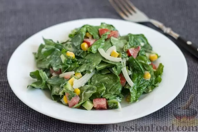 - Салат из шпината с овощами и кукурузой: яркое и легкое блюдо, наполненное витаминами. Идеальный вариант для обеда или ужина.
