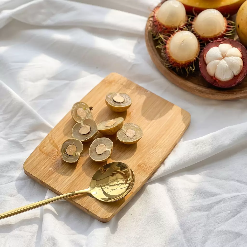Свежий лонган имеет однородную светло-коричневую кожуру и сладкую прозрачную мякоть, напоминающую виноград. Признаки недостаточной свежести включают сморщенную или мягкую кожуру и кислый запах.