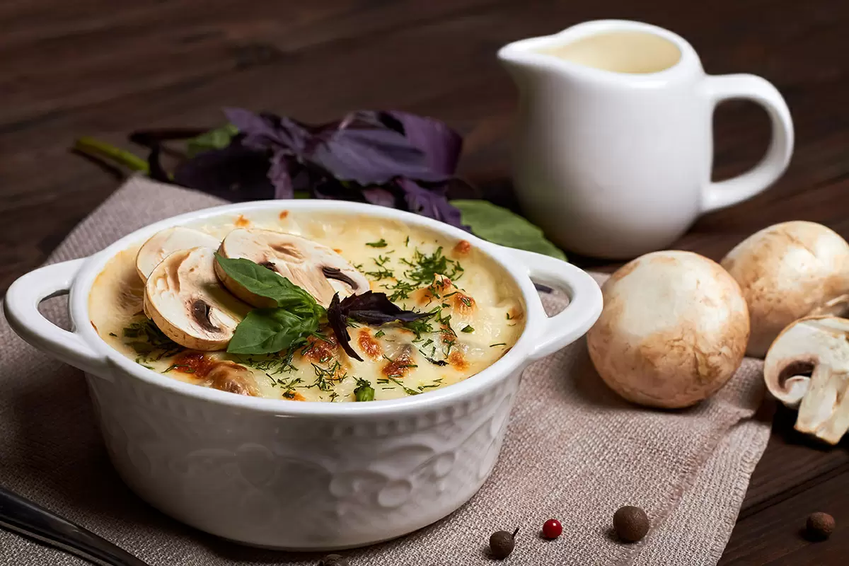 - Жюльен: сочетание куриного филе и грибов в сливочном соусе — сытное и вкусное угощение, которое можно подавать с хрустящим багетом.