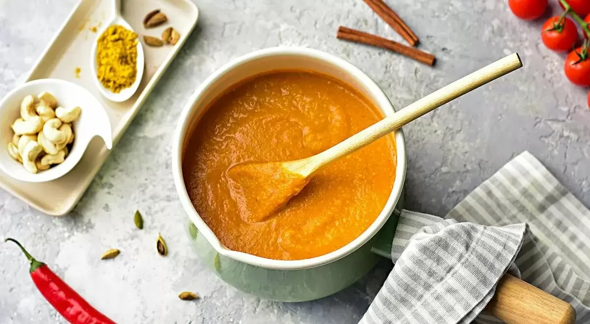 - Луково-томатная основа: В 100 мл растительного масла обжарьте специи и затем добавьте 500 г нарезанного лука, 1 кг помидоров и 1 ч. л. соли. Потушите и затем измельчите в однородную массу.